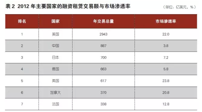 我国融资租赁行业经过高速发展后,市场业已初具规模,市场渗透率已有较大的提升。虽然美、英等国融资租赁市场渗透率高于20%,详见表2所示,但这些国家是市场主导型金融体系;德国、日本、韩国等是机构主导型金融体系,融资租赁市场渗透率明显偏低,大致在6%-15%之间。原因是融资租赁与证券市场融资有极高的互补性,而与银行信贷市场之间存在较明显的市场分割。市场主导型金融体系以证券市场的直接融资为主,银行信贷市场相对不发达,其融资租赁市场渗透率会明显较高。我国是机构主导型金融体系国家, 2013年末我国融资租赁市场渗透率已超过4%,已接近日、韩等国融资租赁市场渗透率近几年波动区间的下限。