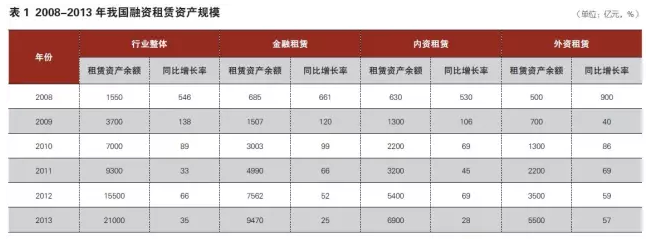 金融租赁在服务实体经济中实现跨越式发展。国内融资租赁行业发展起步以《外商投资租赁业管理办法》(2005年)和《金融租赁公司管理办法》(2007年)的出台为标志。从2007年起,我国融资租赁业迎来高速发展期。截至2013年末,我国各类租赁公司已超过1000家,注册资金超过3000亿元,租赁资产总余额约2.1万亿,详见表1所示,相比2007年末租赁资产总余额的约240亿元,6年来行业资产规模增长87倍。
