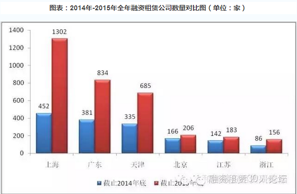 截止2015年底,全国融资租赁企业总数为4508家,比上年底的2202家增加了2306家,其中,金融资租赁企业49家,非金融租赁企业4459家。进一步统计,截止2015年底,全国注册在运营的融资租赁公司约1350家,其中,金融资租赁公司25家,内资试点租赁公司123家,外商投资租赁公司1202家,注册资本金合计超过1022亿。