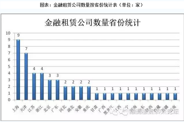 截止2015年底成立的金融租赁公司共计49家,其中最新成立的金融租赁公司是冀银金融租赁股份有限公司。数量最多的省份是上海、天津、江苏和浙江共同位列第三。北京排名第五位。