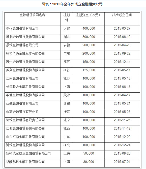 截止2015年底,全国共设立49家金融租赁公司,其中2015年全年共新起并批准注册17家金融租赁公司,这17家公司分别是: