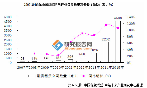 截至2015年底,全国融资租赁企业总数约为4508家,比上年底的2202家增加2306家,其中,金融租赁企业47家,增加17家;内资租赁企业190家,增加38家;外资租赁企业4271家,增加2251家。
