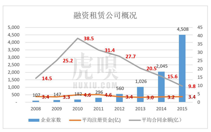 2008年以来,登记在册的融资租赁公司数量虽然从107家大幅增至4508家,但每家公司平均注册资本却停步不前。各家持有租赁合同的余额更是不升反降,2008年是14.5亿,2010年曾经高达38.5亿,到了2015年仅有9.8亿。考虑到通胀因素,融资租赁公司的实力大幅降低。不到10个亿的业务量,深耕、做透一个行业,规模效益都是天方夜谭。