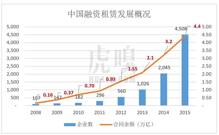 2008-2015年,我国融资租赁业务总量由1550亿增至4.4万亿元(以下货币单位如无特别说明,均为人民币);融资租赁企业数从107家增至4508家。外资一直是租赁业的主力,外资租赁企业占比从2012年的82.14%增至2015年的94.74%。2015年末,金融租赁企业、内资租赁企业和外资租赁企业分别有47家、190家和4271家。