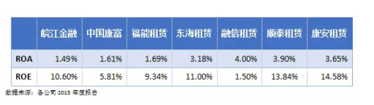 从营业收入增长率和净利润增长率来看,各公司差别较大。2015年,中国康富净利润增长率高达135.74%(根据中国康富的年报显示,2015年集团开拓市场,完善筹资结构,毛利率增长,从而使本年营业收入大幅增长),而福能租赁、融信租赁2家的净利润增速均在2015年出现下滑,营业收入增长率也相应偏低,其中融信租赁营业收入增长率最低,仅为1.55%(融信租赁表示,2015年营业收增长较少主要由转租赁等业务询问费减少所致)。