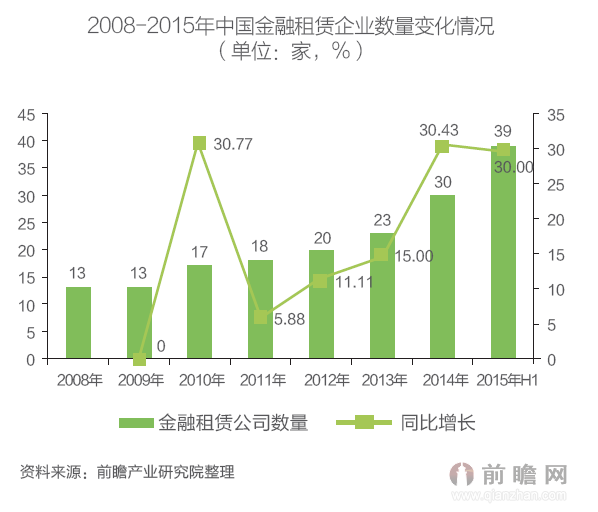 截至2015年6末,中国金融租赁行业较上年增加了9家企业,总数达到了39家。