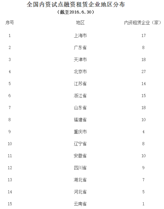 据中国租赁联盟和天津滨海融资租赁研究院统计,截至6月底,全国共有190家内资试点融资租赁企业,分布在27个省、市、区。其中北京最多,有27家企业。