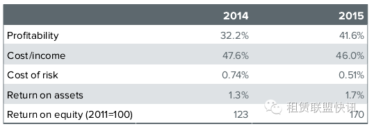 受风险准备金大幅降低的影响,盈利能力比率从32%上升至近42%。这意味着风险成本从2014年的0.7%降至2015年的0.5%。