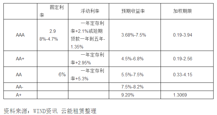 融资租赁ABS发行中,由于原始权益人不同、标的物差异等因素,票面要素如计息方式、债券加权期限也存在较大差异,即使是同一原始权益人与发行人,由于债券的结构化设计,其债券利率与加权期限也存在着较大的差异,为此本文并没有对每只债券的票面要素进行分析,而是对不同评级债券的计息方式,如采用固定还是浮动利率或预期收益的方式进行分析。其中评级为AAA的债券,采用固定利率方式的,利率多在2.98至4.7%之间,而预期收益率多在3.68至6.5之间(易汇A2的预期收益率最高,为7.5%,与其它AAA评级债券的利率存在较大差异),加权期限在0.19至3.94年间,其它AA+、AA、A+评级债券的对应的计息方式、加权期限具体情况如下表。