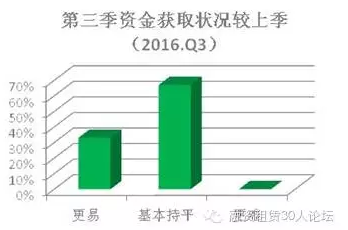 2016年第三季度,融资租赁行业资金获取指数为73%,与上一季度该指数维持同一水平。