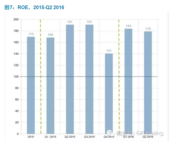 与2015年第二季度相比,2016年第二季度ROA和ROE1均下降,分别达到1.8%和179. 下降的原因是由于与2015年相比贷款损失准备金的增加导致的盈利能力率的疲软。
