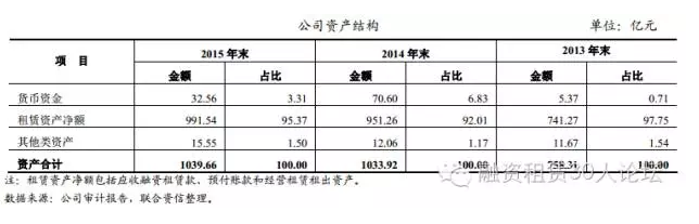 租赁资产是公司最主要的资产组成部分,占资产总额的比重超过90%。 2015年,租赁资产净额增速明显放缓,截至2015年末,公司租赁资产净额为991.54亿元,以融资租赁资产为主。2015年,招银金融租赁加大经营租赁业务拓展力度,截至2015年末,招银金融租赁经营租赁租出资产净额20.53 亿元,较上年末有所上升。