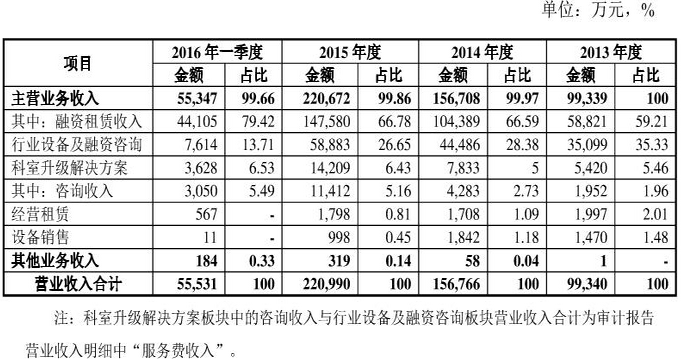 公告显示,环球租赁的营业收入主要包括融资租赁收入、行业设备及融资咨询收入、科室升级解决方案收入等,2013-2015年及2016年一季度营业收入构成情况如下: