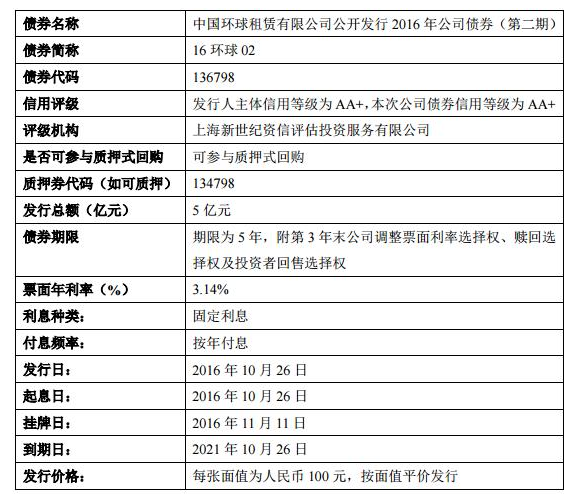 2016年9月,环球租赁发行首期公司债,发行规模为6亿。
