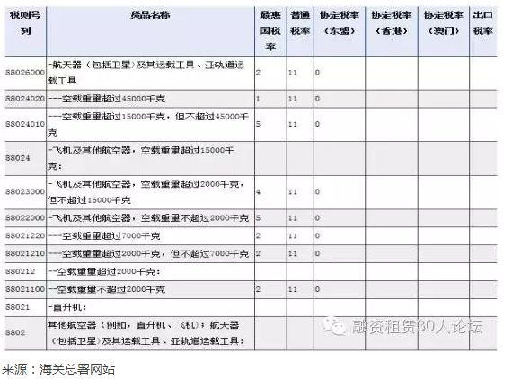 我国对大飞机的进口实行鼓励政策,空载重量在45吨以上的大飞机适用1%的优惠税率。详见以下海关总署网站截图: