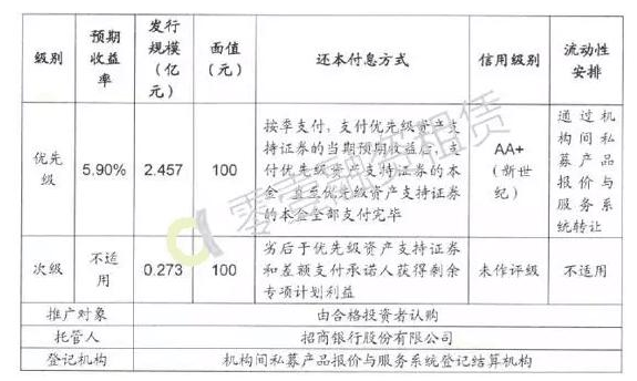 本期证券分为优先级、次级两档,优先级发行规模2.457亿元,分层比例占90%,预期收益率为5.90%,按季支付,上海新世纪资信评估投资服务有限公司评级AA+;次级规模为0.273亿元,分层占比10%。