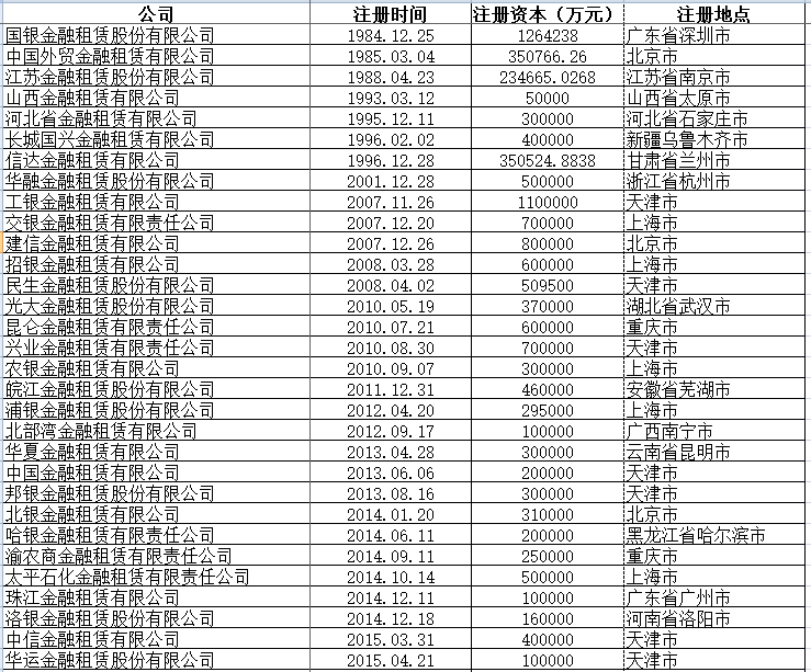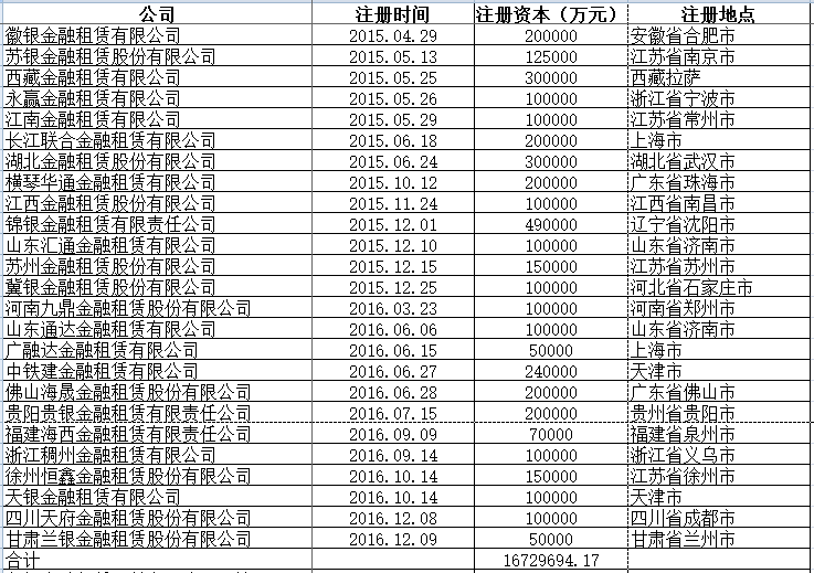 据统计,截止2016年12月31日,全国共有56家金融租赁公司(不含3家金融租赁专业子公司)已开业,还有8家正在筹建,注册资金累计达1672.9694亿人民币。