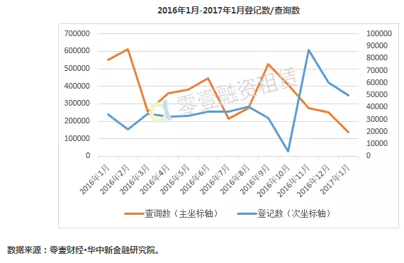 从登记数量来看,截至2017年1月底,累计登记数已达246万,累计查询数达1099万。2017年1月登记数为49809,同比增加46.67%;查询数为138867,同比减少了298%。