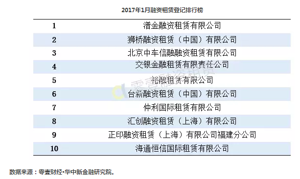 2017年融资租赁登记排名第一的为潽金融资租赁有限公司,该公司2016年7月首次以第一出现在融资租赁登记排名榜,随后长期保持在前十榜内。