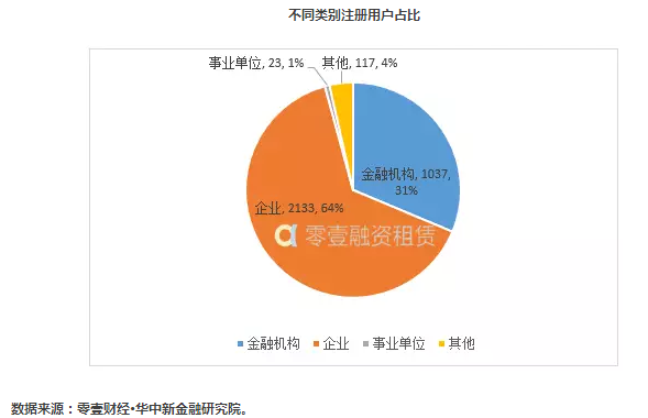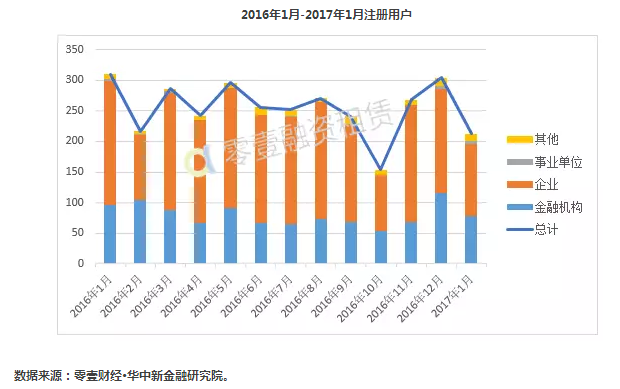 2016年1月-2017年1月注册用户累计达3310位,其中,企业注册用户最多,有2233位,占总注册用户数的64.44%;金融机构占比较少,为31.33%;事业单位及其他类占最少,分别占比0.69%和0.35%。