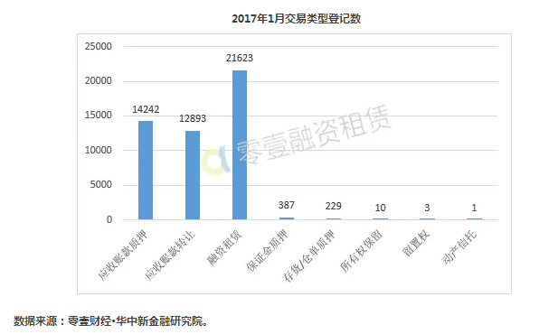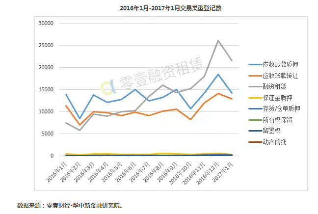 2017年1月登记数最多的类型主要为融资租赁、应收账款质押及应收账款转让三类,分别登记了21623、14242、12893;保证金质押、存货/仓单质押登记数分别为387、229;所有权保留、留置权、动产信托类登记数分别为10、3、1。