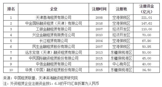 据中国租赁联盟和天津滨海融资租赁研究院数据显示,在以注册资金为序的2016年天津市融资租赁企业十强排行榜中天津渤海租赁有限公司以221.01亿元人民币位居首位。