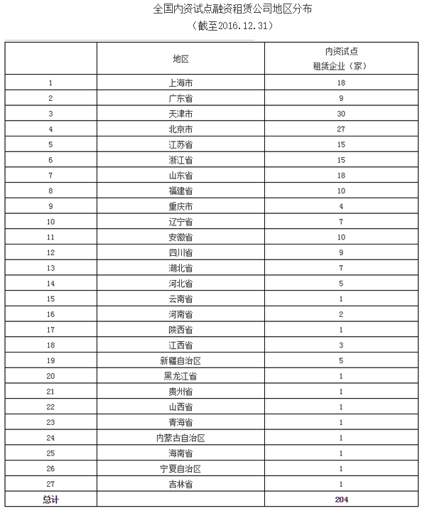 据中国租赁联盟和天津滨海融资租赁研究院统计,截至2016年底全国共有204家内资试点融资租赁公司,分布在全国27个省、市、区。