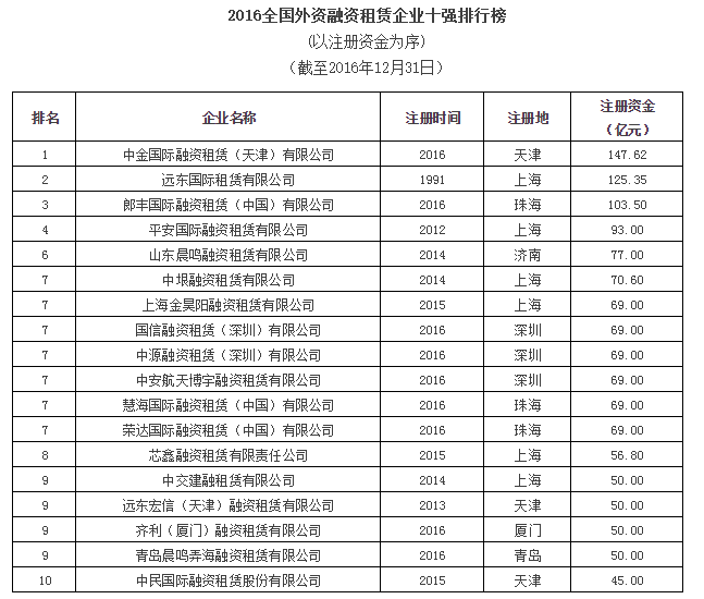 2016全国外资融资租赁企业十强排行榜