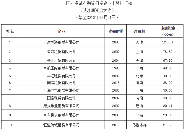 2016全国内资试点融资租赁企业十强排行榜