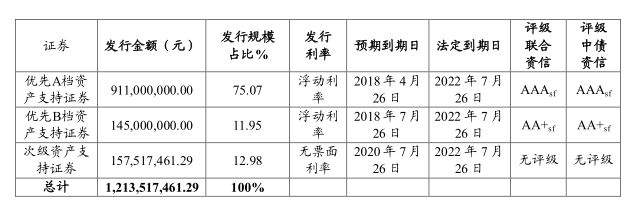 本期证券包括优先级资产支持证券和次级资产支持证券。优先级资产支持证券包括优先 A 档和优先 B 档资产支持证券。优先A档资产支持证券91,100.00万元、优先B档资产支持证券14,500.00万元和次级资产支持证券15,751.75万元。