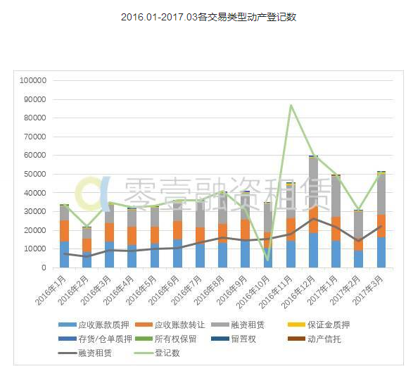 一季度融资租赁动产登记数同比增长153.7%。从2016年开始,融资租赁登记数整体呈上升态势,2017年1、2月有所回落,3月开始上升。