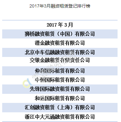 2017年3月融资租赁登记排名前三名分别为狮桥租赁、潽金租赁、北京中车信融租赁。