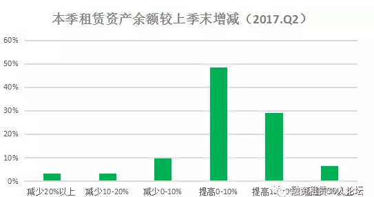 2017年第二季度, 6%参与调查高管所在企业租赁资产余额比上季增加20%以上;29%参与调查高管所在企业租赁资产余额比上季增加了10-20%;48%参与调查高管所在企业租赁资产余额比上季增加了0-10%;3%参与调查高管所在企业租赁资产余额比上季减少了20%以上。