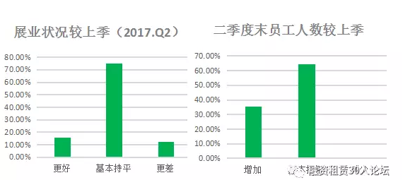 另外,64.5%被调查企业第二季度人员数量较上季度基本不变,35.5%有所增加,上季度这一数字为73%。本季度无企业表示人员数量减少。