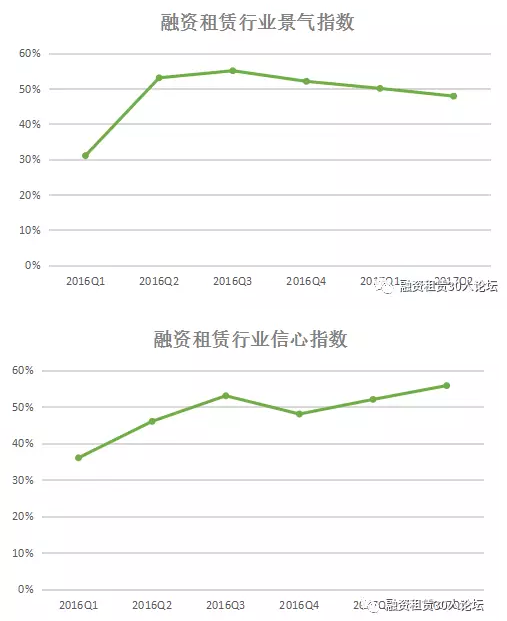 中国融资租赁三十人论坛(CFL30)联合中国外商投资企业协会租赁业工作委员会、天津东疆保税港区进行的调查显示:2017年第二季度,融资租赁行业景气指数为48%,较2017年第一季度的50%下降2个百分点,反映出行业发展呈微弱收缩态势。