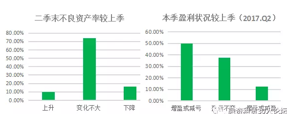 2017年第二季度,50%参与调查的高管表示本季度所在企业盈利状况较上季度更好;37.5%参与调查的高管表示基本持平;另有12.5%的高管表示较上季度更差。74%参与调查的高管表示,其所在公司不良资产比率较上一季度变化不大。