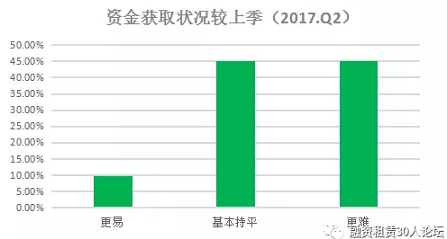 2017年第二季度,10%的被调查高管表示本季度所在企业融资较上季更易,较上季下降3个百分点;45%的被调查高管表示基本持平,较上季上升5个百分点;45%的被调查高管表示本季度所在企业融资较上季更难。