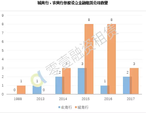 2014年以来,城商行、农商行迅速涌入金融租赁行业。截至2017年6月底,共有23家城商行参与设立金融租赁公司,9家农商行参与设立金融租赁公司。
