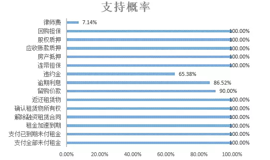 结论二:逾期利息几乎是每一家租赁公司要主张的诉求,主张的比率达到了79.46%,而违约金诉求主张的比率为23.21%,这说明虽然租赁合同司法解释是允许租赁公司违约金和逾期利息同时主张的,但大多数租赁公司还是倾向于主张逾期利息。