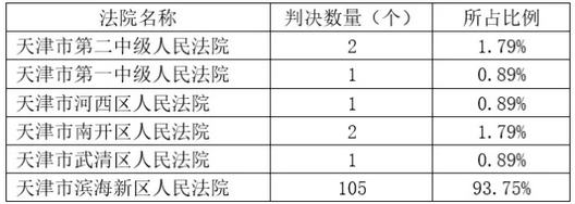 经统计,2016年天津市共有6个法院做出过关于融资租赁案件的一审判决,判决数为112个,上述判决在各法院的分布情况见下表: