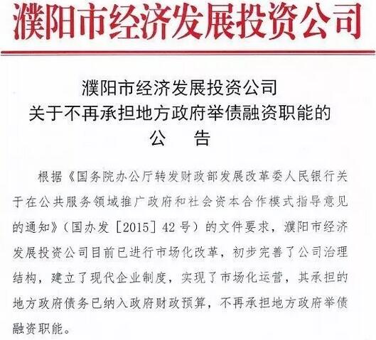 10月13日,濮阳市经济发展投资公司发布《濮阳市经济发展投资公司关于不再承担地方政府举债融资职能的公告》,根据《国务院办公厅转发财政部发展改革委人民银行关于在公共服务领域推广政府和社会资本合作模式指导意见的通知》(国办发【2015】42号)的文件要求,濮阳市经济发展投资公司目前已进行市场化改革,初步完善了公司治理结构,建立了现代企业制度,实现了市场化运营,其承担的地方政府债务已纳入政府财政预算,不再承担地方政府举债融资职能。