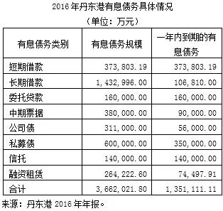截至2016年末,丹东港有息债务总余额366.20亿元,其中一年以内到期的有息债务为135.11亿元,占有息债务总余额的比例为36.90%,融资租赁债务规模达26.42亿元,一年内到期的还款规模为7.45亿元。短期偿债压力较大。