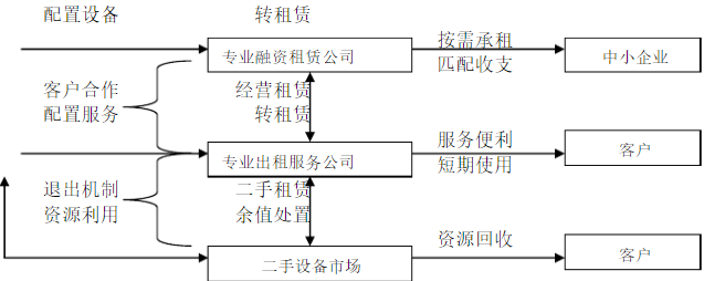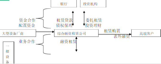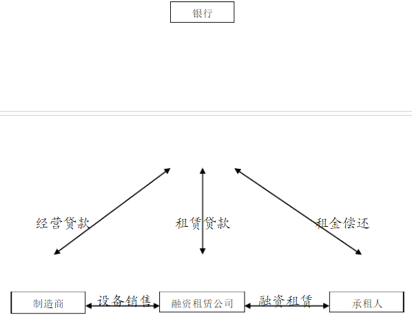 租赁公司在这个新兴经济结构中,买方和使用方分解成两个交易主体。设备流通中,银行的信贷资金,分别形成销售和租赁两个资金流。