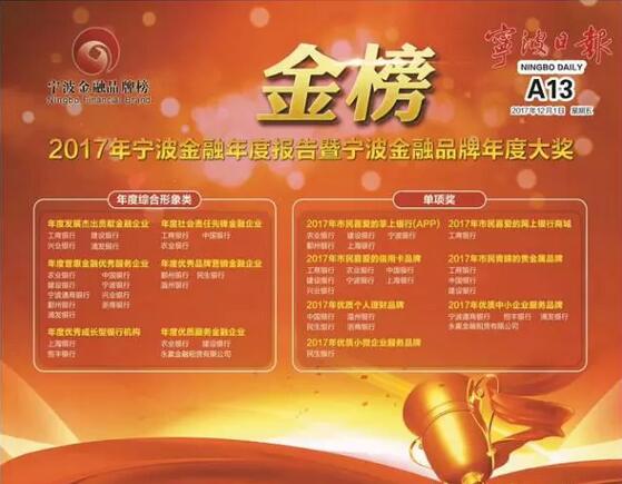 2017年12月1日,《宁波日报》发布2017年宁波金融品牌年度大奖金榜,永赢金融租赁有限公司分别荣膺“年度优质服务金融企业”奖和“2017年优质中小企业服务品牌”奖两项大奖。