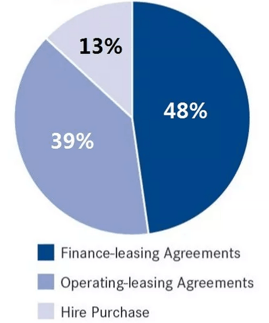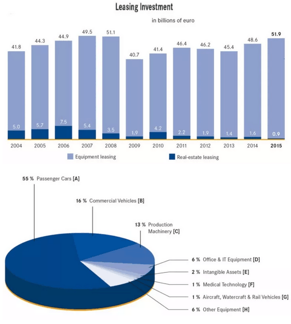 第四,德国的融资租赁业逐步从经济危机中复苏。在2009年经济危机中,德国和欧洲融资租赁行业也受到很大影响,一直到2015年整个经济开始复苏,才基本上是恢复到2007年、2008年的水平。在2016年,通过租赁实现的投资达到642亿欧元,其中设备是551亿欧元,房地产租赁在欧洲就不是常见的租赁类别。