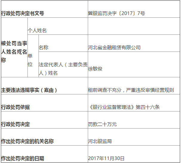 12月23日讯 据银监会网站消息,河北省金融租赁有限公司租前调查不充分,严重违反审慎经营规则,被中国银监会河北银监局罚款二十万元。