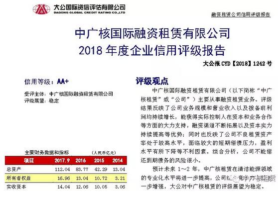 2018年1月17日,大公国际资信评估有限公司(以下简称“大公国际”)正式发布《中广核国际融资租赁有限公司2018年度企业信用评级报告》(大公报CYD【2018】1242号),评定中广核国际融资租赁有限公司(以下简称“中广核租赁”)的信用等级为AA+,评级展望为稳定。这是中广核租赁的首次主体评级,评级结果体现了权威评级机构对公司的认可。