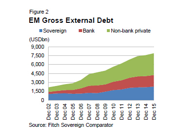 自全球金融危机以来,由于主要发达国家基准利率纷纷降至历史最低水平,甚至降为零,许多新兴市场因此抓住时机大举借债。根据惠誉提供的数据,新兴市场国家外债总额自雷曼危机以来已增加2.8万亿美元,至7.5万亿美元。Dealogic数据显示,仅今年前七个月,中国企业和银行发行的美元计价债券规模就达到570亿美元,创下历史记录。