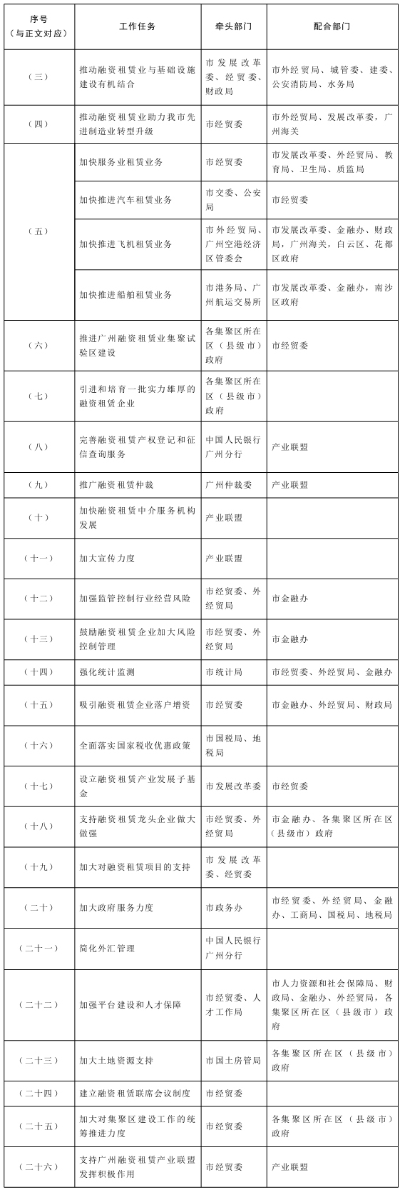 (二十四)建立融资租赁联席会议制度。充分发挥政府在融资租赁产业发展中的引领带动作用,成立由分管副市长任召集人,融资租赁业相关单位为成员单位的融资租赁联席会议制度,联席会议办公室设在市经贸委。定期召开相关协调会,采取“项目带动创新”的方式,在项目推进中发现瓶颈问题,针对该问题,积极争取国家和省的支持,在解决瓶颈问题后,实现流程贯通,完成功能创新。对于事关全局的重大金融改革创新事项要及时报送市深化改革领导小组审议。
