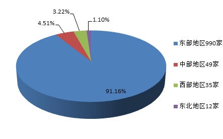 东部地区融资租赁企业数量占据绝大部分,达到全国总数的91.16%。上海、天津、北京成为我国融资租赁企业集聚地,三省市融资租赁企业数量占全国的48.8%。上海市融资租赁企业数量最多,为228家,其次为天津186家、北京116家。上海市融资租赁企业当年新增业务投放量也最多,达到1333.83亿元,占全国当年新增业务投放量的34.52%,其次为北京和天津,分别为910.77亿元和481.63亿元,三省市新增业务投放量超过全国的70%。